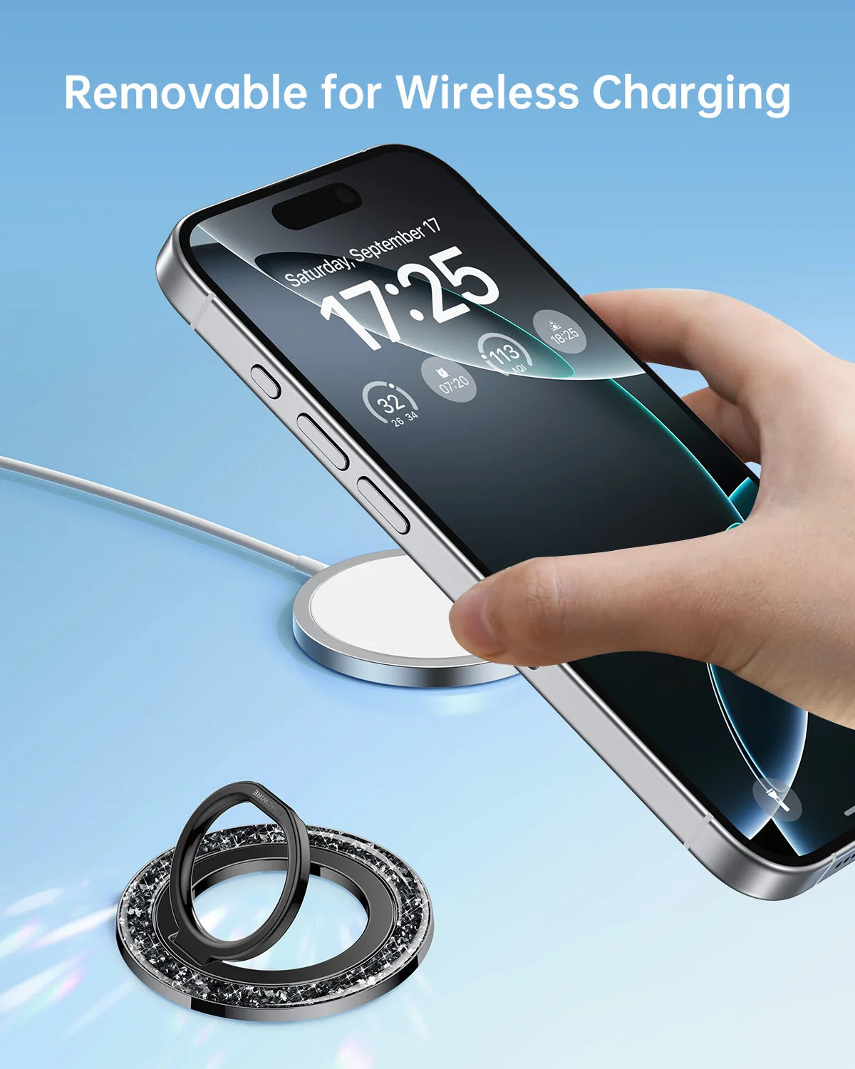 - Super Strong Magnetic: The Syncwire Glitter Magnetic phone ring holder is made with N55 NdFeB magnets, providing exceptional magnetic force. You can securely attach your phone to the MagSafe magnetic phone ring holder with just one finger, experiencing a strong hold that resists shaking or movement. The magnetic force can be enhanced by 5 times when used with the provided metal ring.