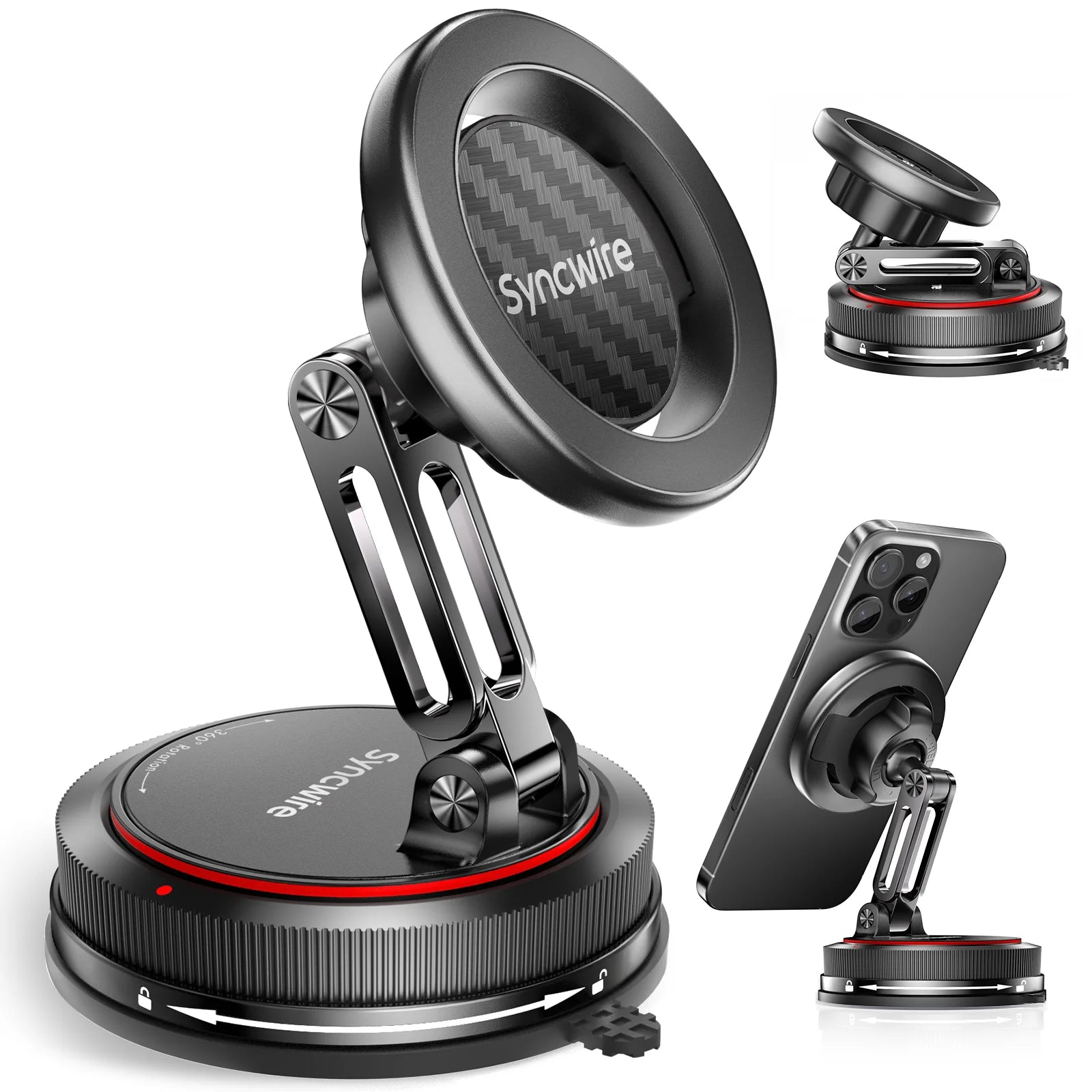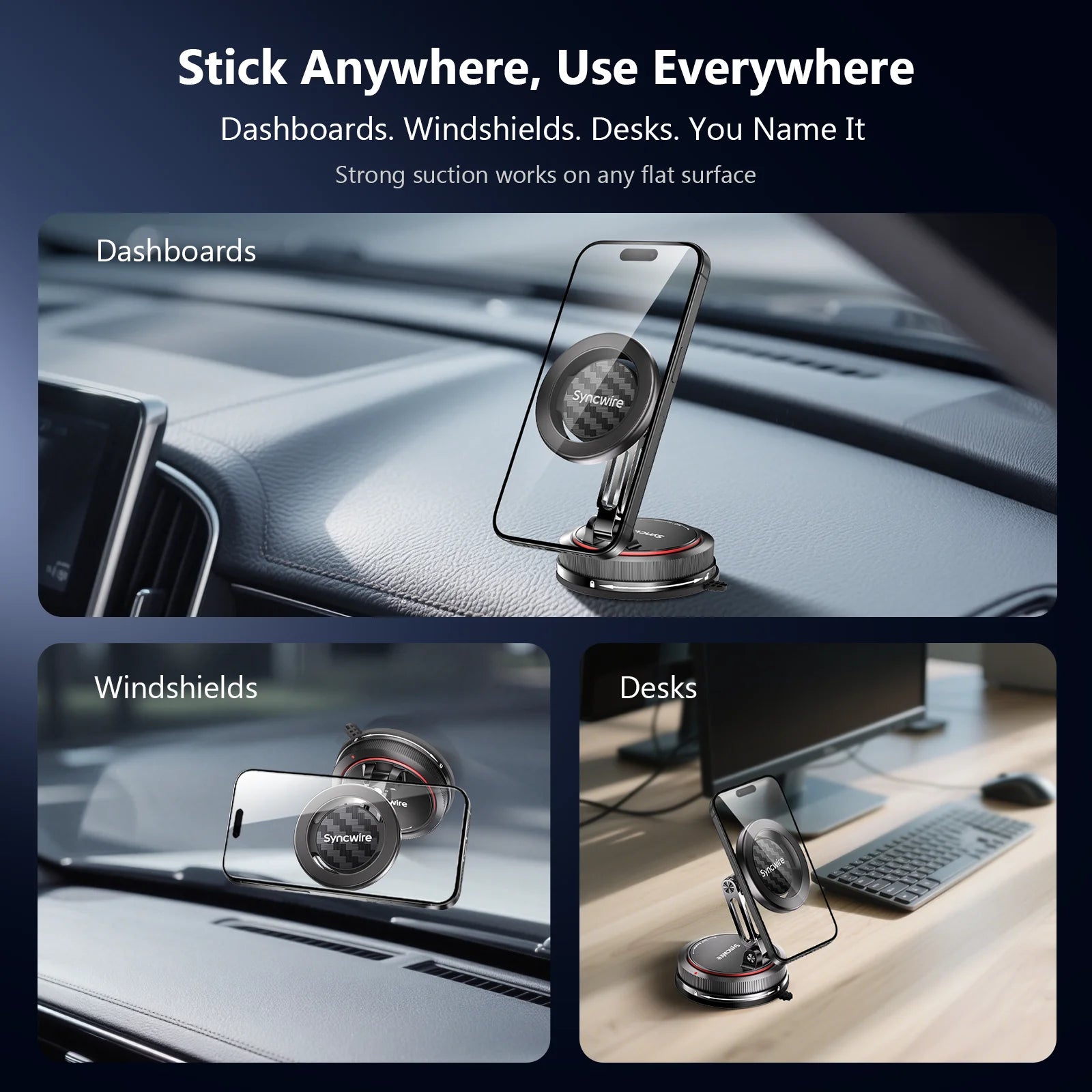 • Succión de potencia industrial con durabilidad extrema: Utiliza una ventosa mejorada con nanogel de 4 capas, que ofrece una fuerza de sujeción de más de 35 kg. Se mantiene firme en tableros, parabrisas e incluso escritorios. Funciona en temperaturas extremas (de -40 °C a 149 °C) y ha sido probado más de 9999 veces para garantizar un uso prolongado.