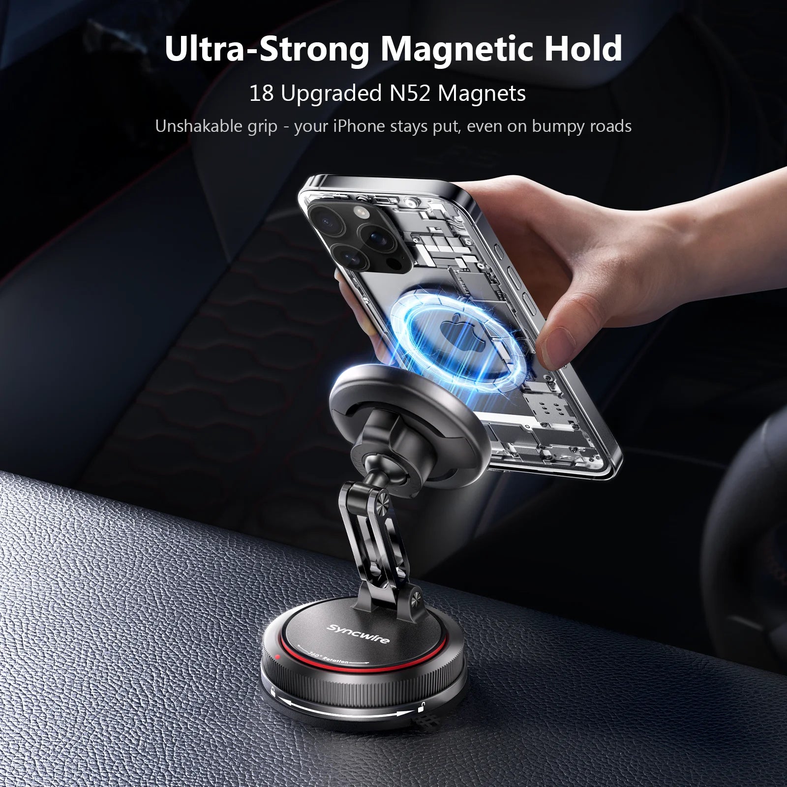 • Potente anillo magnético doble N52 para una sujeción segura: Equipado con 18 imanes N52 mejorados en un diseño de doble anillo, este soporte para coche ofrece una fuerza magnética inigualable. Garantiza que tu teléfono se mantenga firme en su lugar incluso en carreteras con baches y es compatible con todos los iPhones compatibles con MagSafe (iPhone 12 y posteriores) y fundas MagSafe.