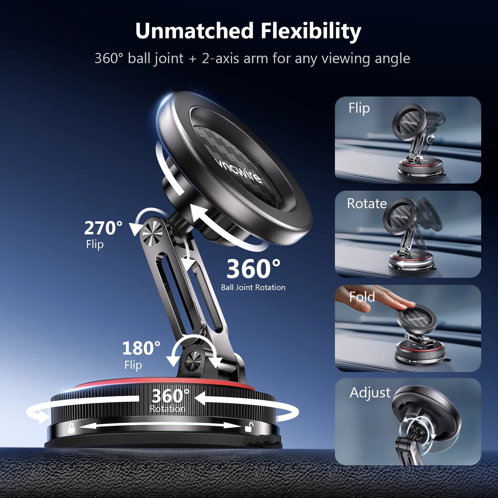 • Totalmente ajustable con brazo plegable de 2 ejes: Cuenta con una base giratoria de 360°, un brazo plegable de doble eje y una rótula magnética desmontable para ajustar el teléfono a cualquier ángulo. Se pliega para reducir el tamaño del soporte a la mitad cuando no se usa, perfecto para mantener el interior del coche ordenado.