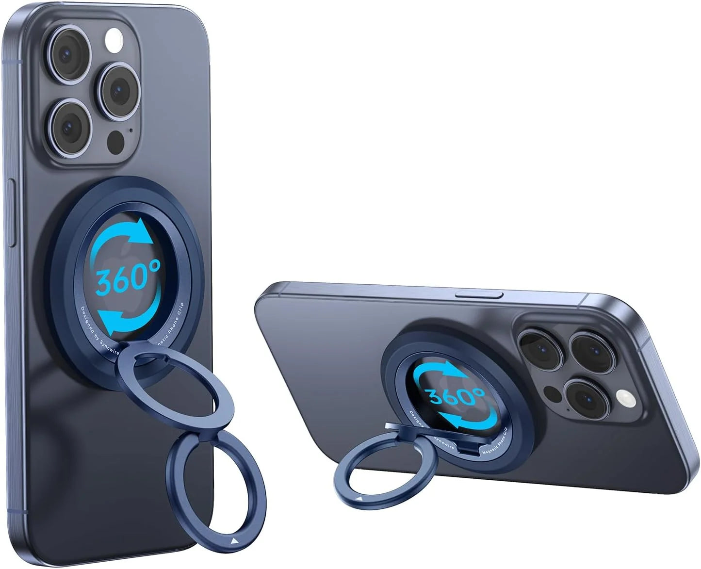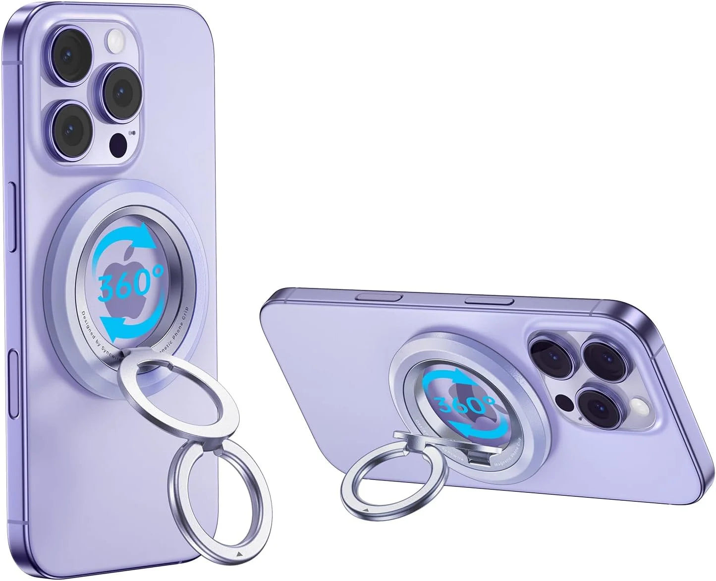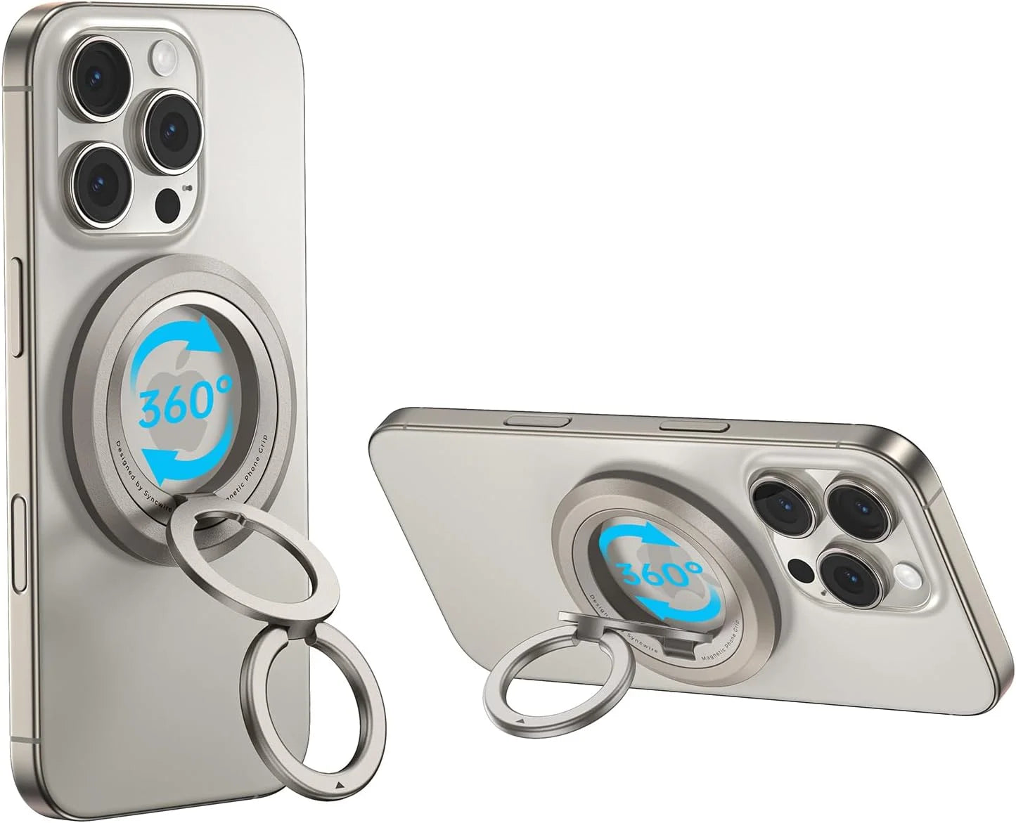 - Magnético súper fuerteEl soporte de anillo para teléfono Syncwire MagSafe utiliza imanes N52 NdFeB para una fuerza magnética excepcional, que se adhiere firmemente al teléfono con un solo dedo. La fuerza magnética se multiplica por cinco con el anillo metálico incluido.